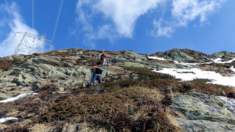 Arrivati sulla roccia, appendiamo le ciaspole ed iniziamo a salire il ripido pendio