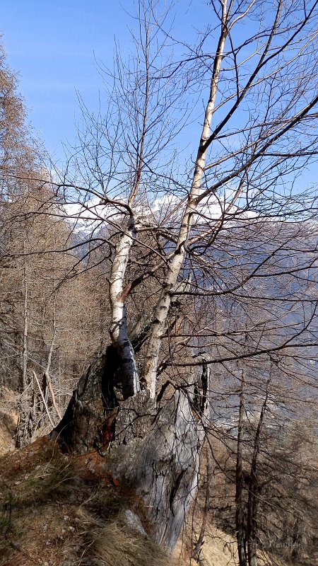 Una betulla cresciuta dentro il tronco morto di un larice