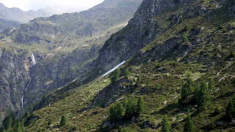 Il sentiero che si deve salire passa poco sotto il nevaio, poi risale per passare sopra la cascata