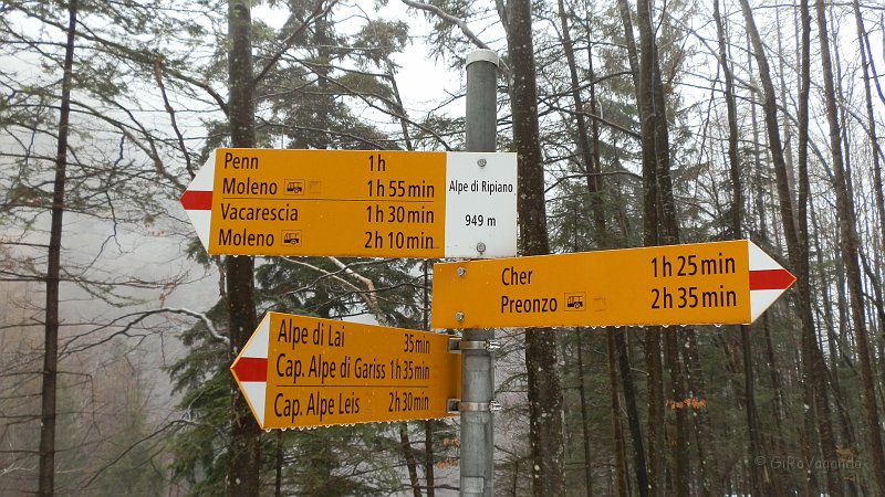 La palina poco oltre il ponte. Qui arriva anche il sentiero che sale da Preonzo. Noi seguiamno per Alpe di Lai, Gariss, Leis
