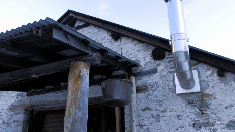 Una caldera appesa fuori una baita