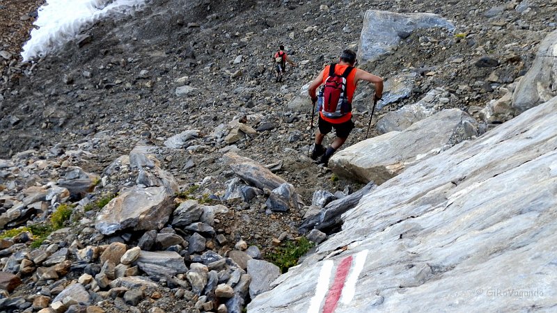 Il sentiero sparisce in un nevaio, ci tocca scendere si terreno ripido e poco stabile