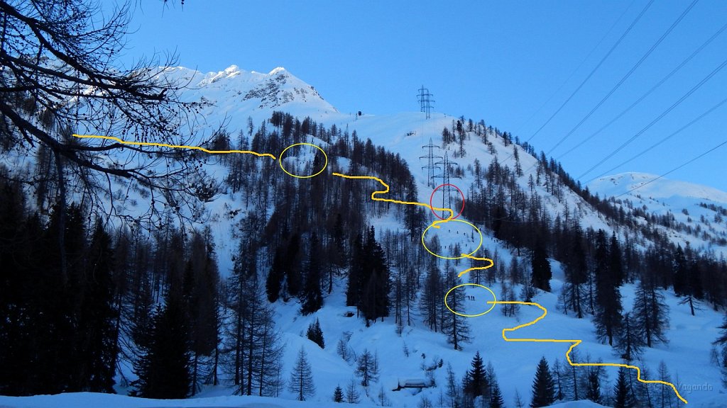 Ecco segnalati: in rosso il pilone dell' alta tensione, il primo riferimento dopo il ponte sul Ticino, nei cerchi in giallo si vedono come puntini vari sci-alpinisti, in giallo una traccia grossolana del percorso