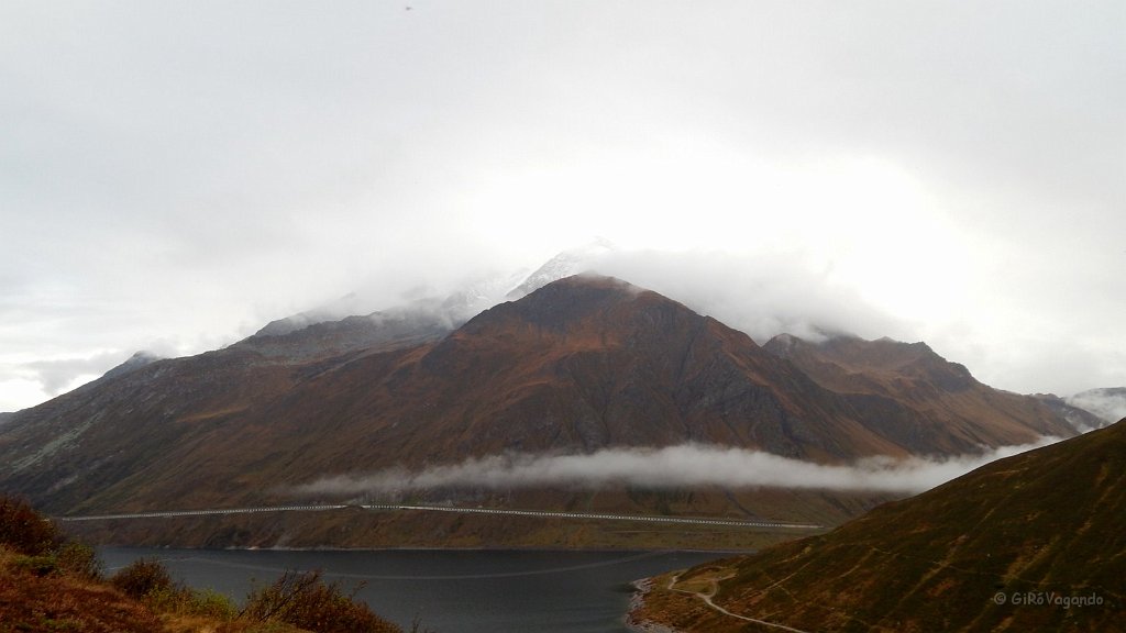 In basso il lago di S.Maria, di fronte a noi nelle nubi lo Scopi