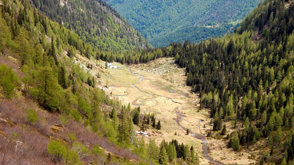 La bella piana paludosa con a sinstra l'Alpe Rescignaga. Il sentiero passa a sinistra su prato e vicino alle piante, il prato è acquitrinoso