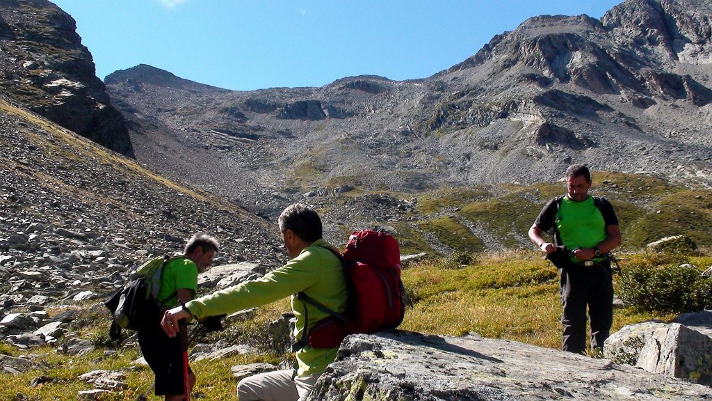 Giunti in basso e ripreso il sentiero, piccola pausa. In alto la Gana Rossa