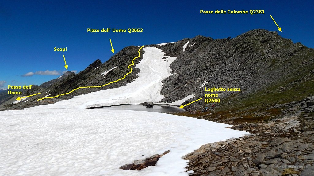 Si sale isul lato sinistro della lingua di neve. Si può anche salire o scendere sul filo di cresta a destra, ma meno agevole