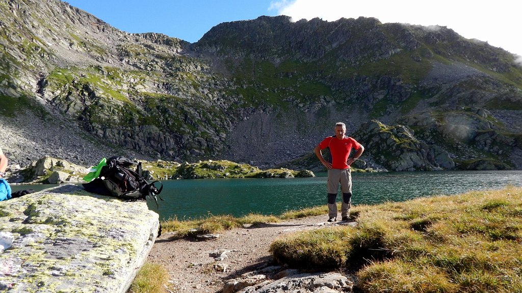 Sosta al laghetto. Per salire alla cima bisogna raggiungere la bocchetta che si vede al centro e poi deviare a sinistra lunga la cresta