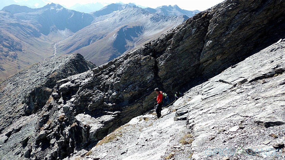 37 Salendo si stringe, e all'altezza dell'ometto, Q3006 sulla cresta, si passa sul lato OVEST. Qualche metro di attenzione |