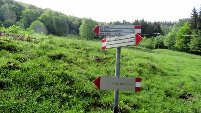 23 Incrocio di sentieri. Qui siamo saliti sul prato costeggiando la recinzione