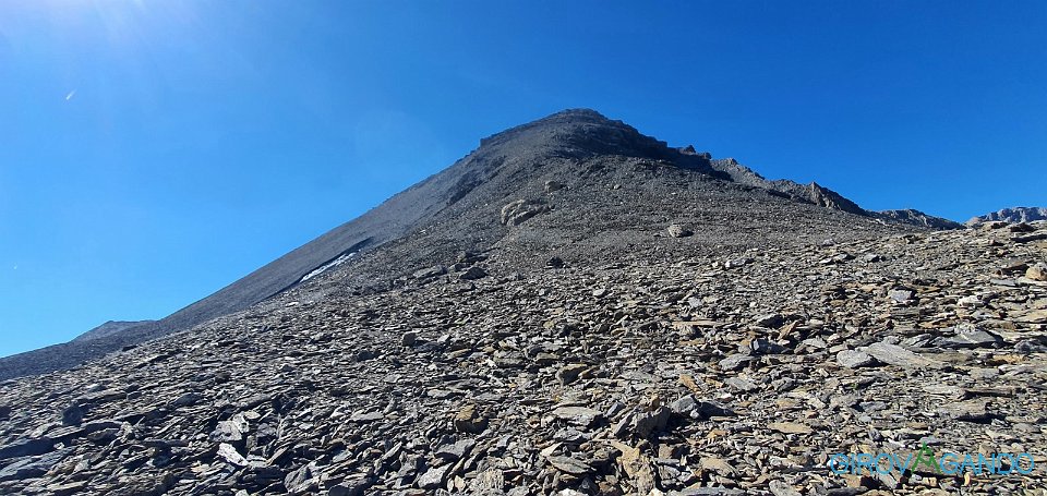 36 Ecco la Fuorcla Pischa, a sinistra la ripida dorsale che porta in cima |