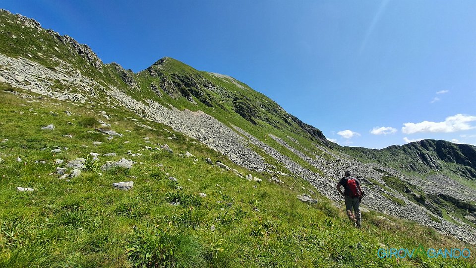 45 Verso il Passo Porcile, si intravvede il sentiero per la cima che traversa in orizzontale |