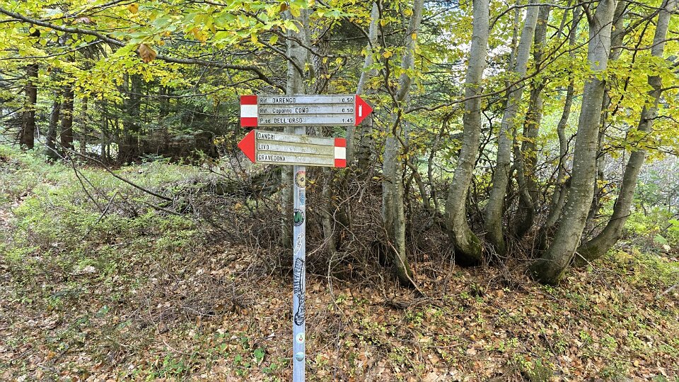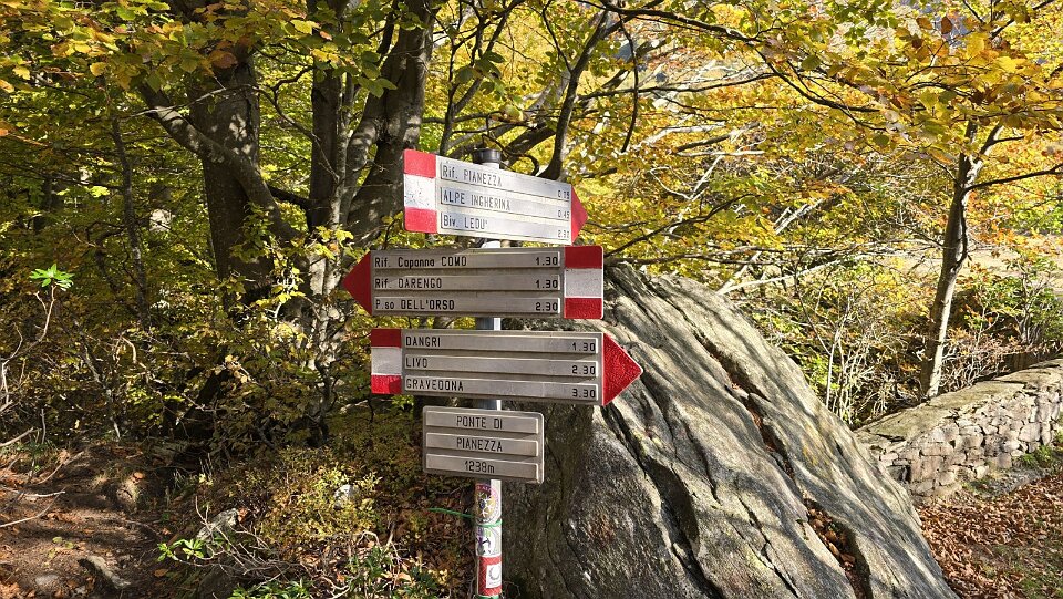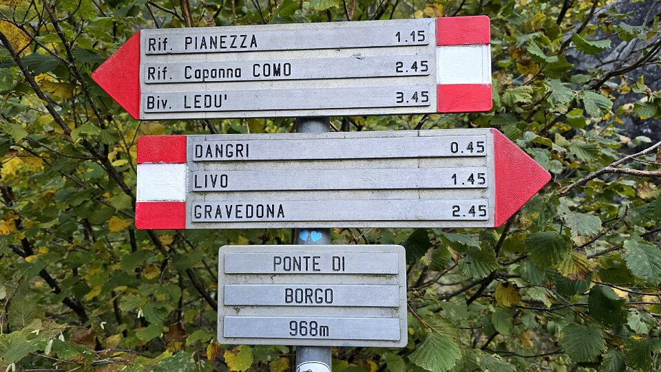 Dangri 630m, parcheggio alla fine della strada a pedaggio (3€), ticket alla fermata autobus di Livo