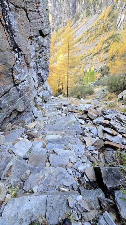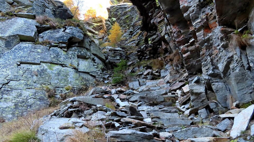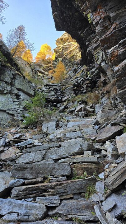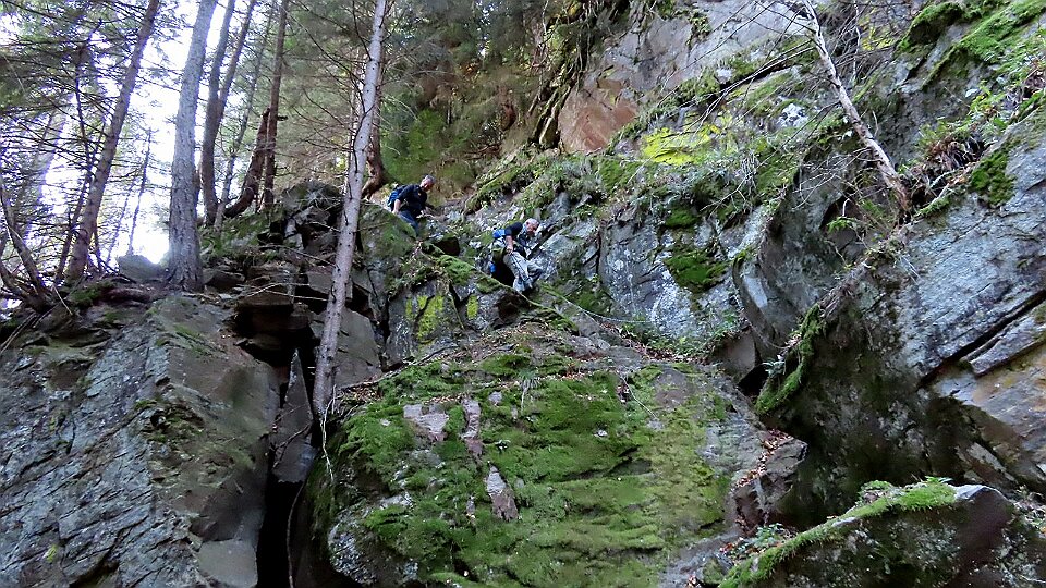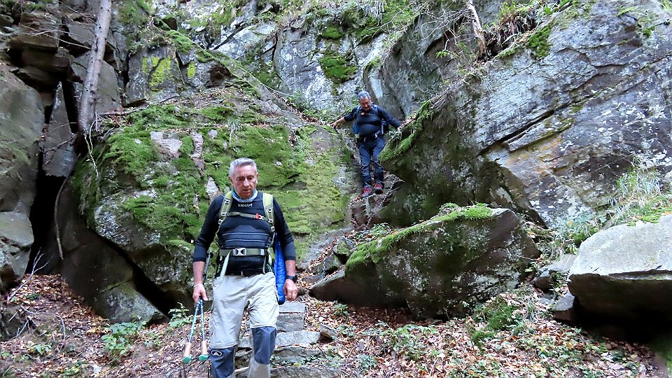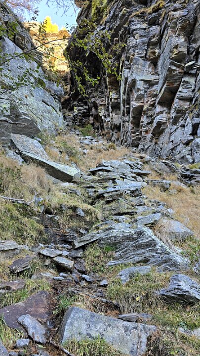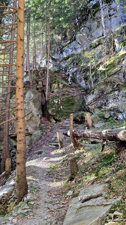 Il sentiero passa a sinistra del ruscello sale fino ad un intaglio attrezzato a gradini nella bastionata rocciosa