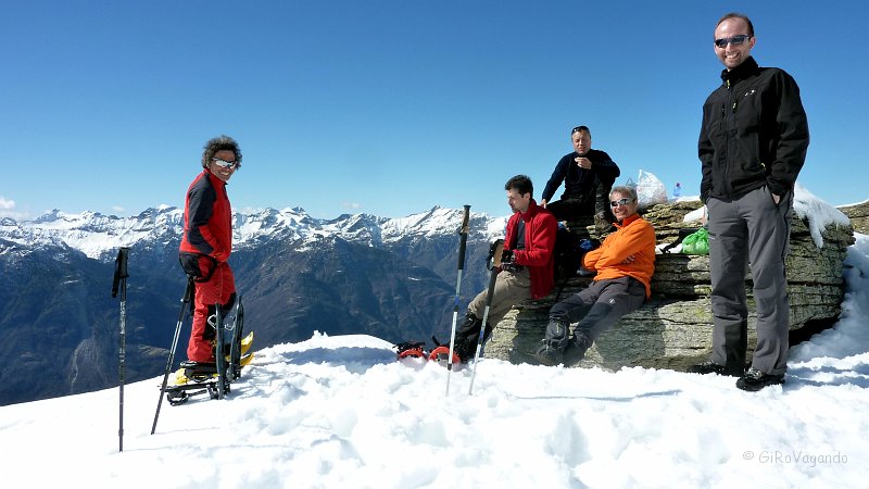| Come detto desistono (e per far desistere Paolo ...), e in mezz'ora sono di ritorno, si accomodano per pranzare anche loro. Ci raggiunge Rocco, di Varese, che ha soggiornato in capanna |