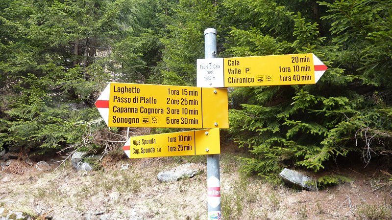 Primo bivio, a Faura di Cala Sud 1537mt, da qui si può salire all' Alpe e Capanna Sponda o proseguire per il laghetto (9:56, +1:26)