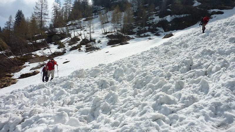 Iniziano le grandi fatiche, cercando i segnavia, la neve marcia, e le tante slavine (che hanno scaricato quindi non presentano pericoli, anzi qui la neve è portante)